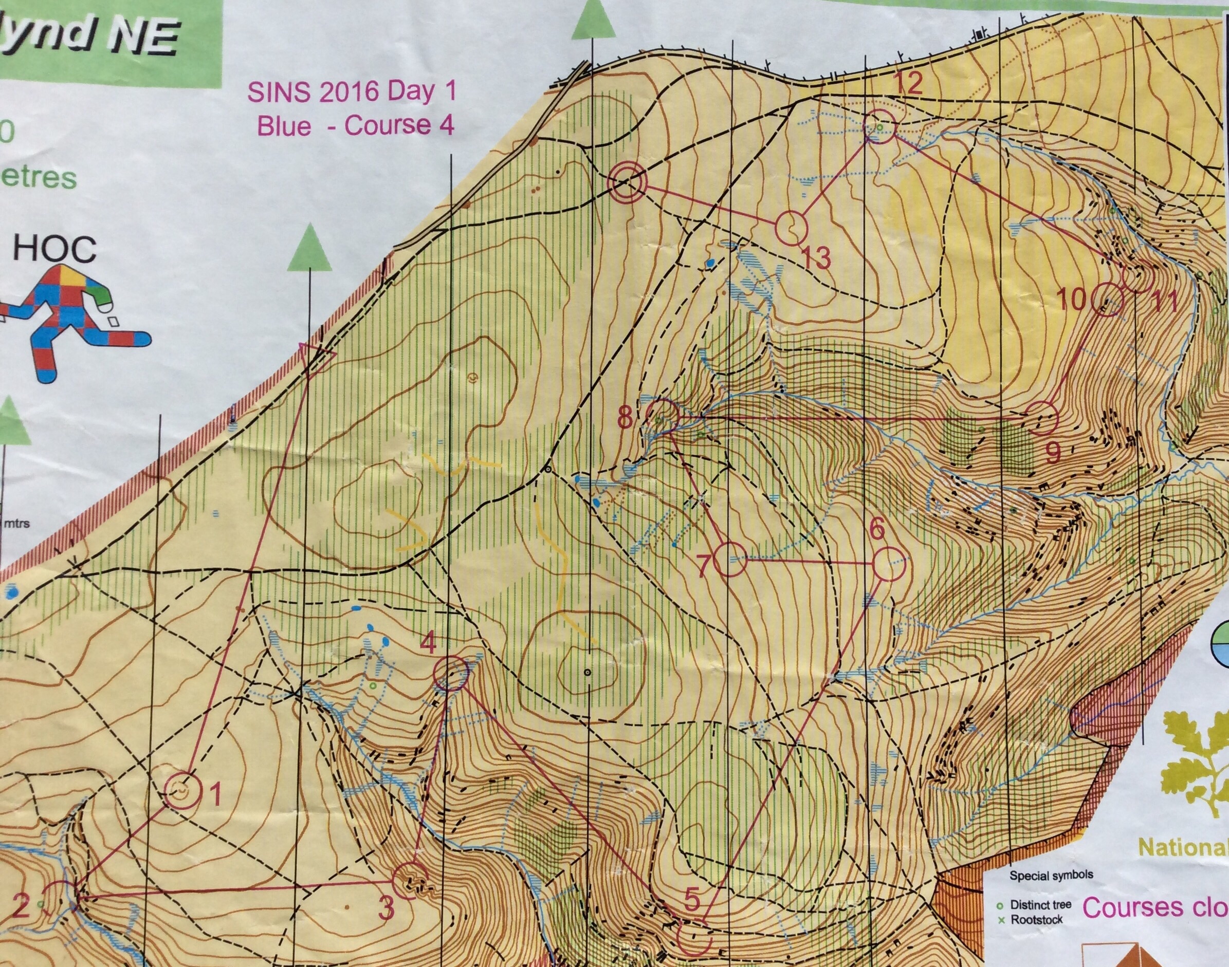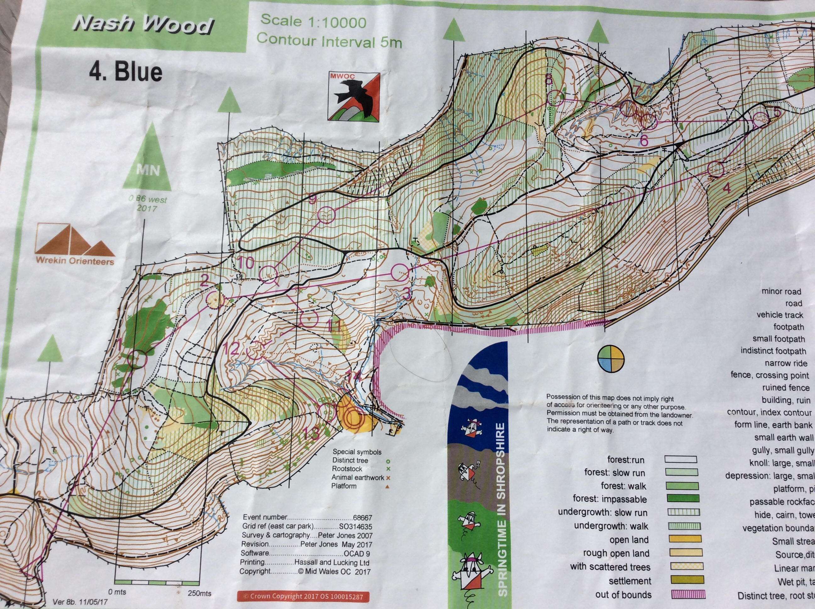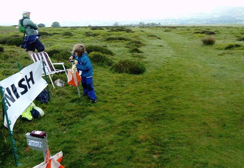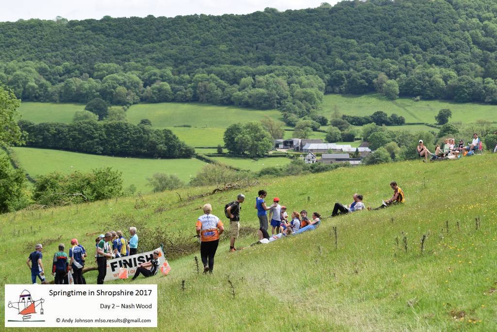 Day two was supposed to be at Caer Caradoc on the other side of the valley, which would have been delightful, if a little hilly. Instead we headed south to Herefordshire to Nash woods near Presteigne. This was more reminiscent of a Quantock hillside with the novelty of a venture into Wales for controls located on the north-side. The walk to the start was 2 km through verdant pastures with a steep climb through bluebells to the start. This was Esk’s first white completely on her own, with all four of us setting off on our own way to hopefully re-group at the finish. The shorter courses followed a network of rather confusing paths causing the odd problem for both girls, however Esk survived without incident, extolling her new found “freedom”. Light green and Blue headed to the far eastern end of the wood with Rebecca climbing to the 321m summit. The blue was tougher underfoot than the previous day and more tiring. The 105 metre climb to #1 along a network of tracks and slopes in search of an inconspicuous platform was a testing start. I made an error at #7 among a series of seven large re-entrants. In fairness, the lack of reading glasses and the dark woodland did little to help my map reading and despite the short distance I wasted time hunting for the control along the wrong stream. I was careful not to make the same mistake at #12 by keeping high and counting off the re-entrants.