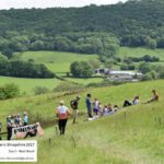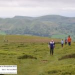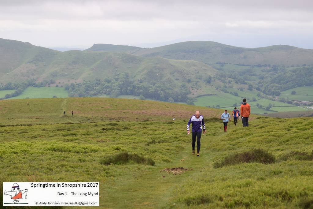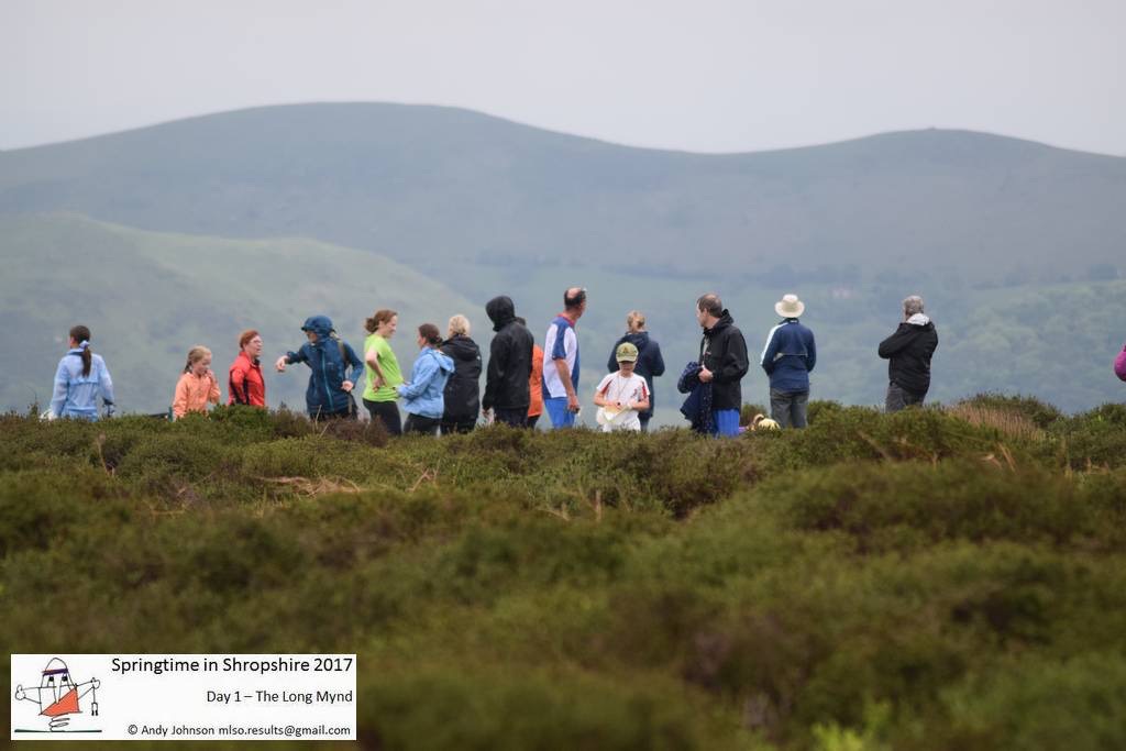By the time I started the blue, the mist had cleared, the sun was out and the Shropshire hills were in full glory with distant views to the Wrekin. The first control offered the choice of two sides of a triangle along paths, or the direct hypotenuse on a bearing across heather. Feeling full of beans I decided that the heather was more fun, which worked well until the growth was thigh high, quickly draining any surplus supplies. The course from there on was technically straight forward and an absolute delight as it traversed the escarpment of various hollows and batches in search of crags, boulders and springs. A clear vision of the landscape certainly helps, but with three or four distant controls in sight, it was crucial to keep map contact and aim for the right one. The fantastic, quick-paced, airy dart along the sheep walks and ridge edge paths was rather spoiled by the final two controls, which required 110 metres of gradual but tiresome hillside ascent in pursuit of a moorland re-entrant and a lonesome hawthorn tree. This must be the only time when I have ventured to walk (or stagger) on my way to the finish.