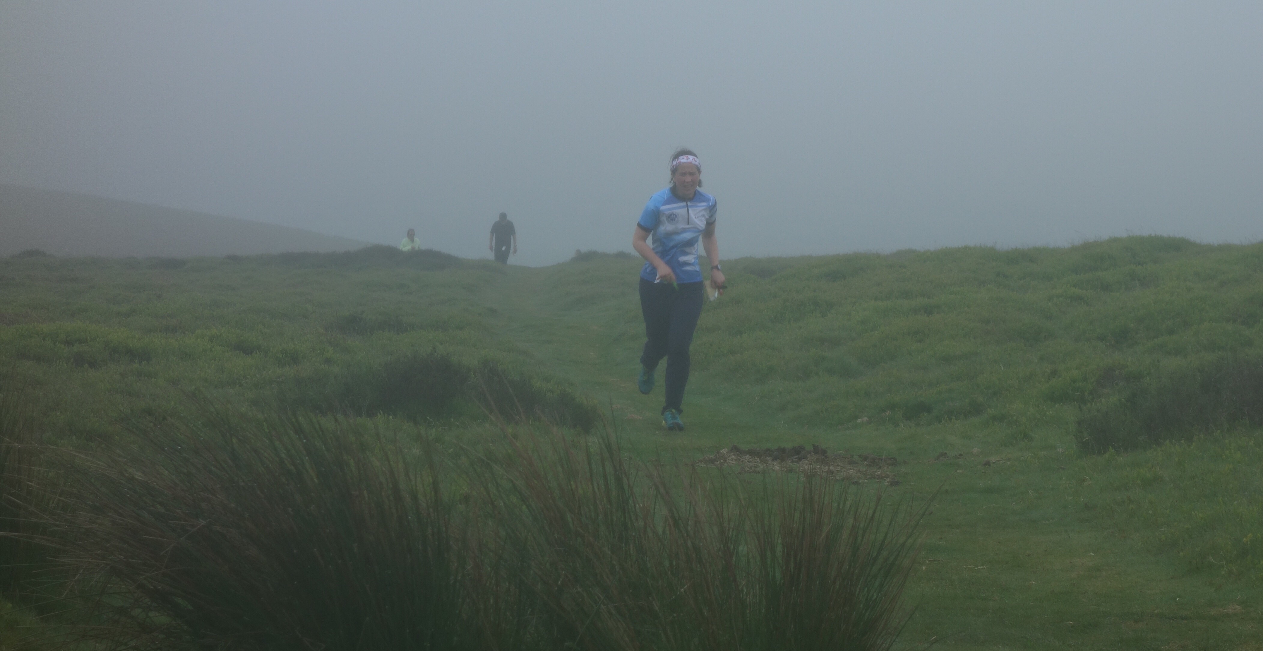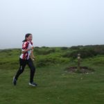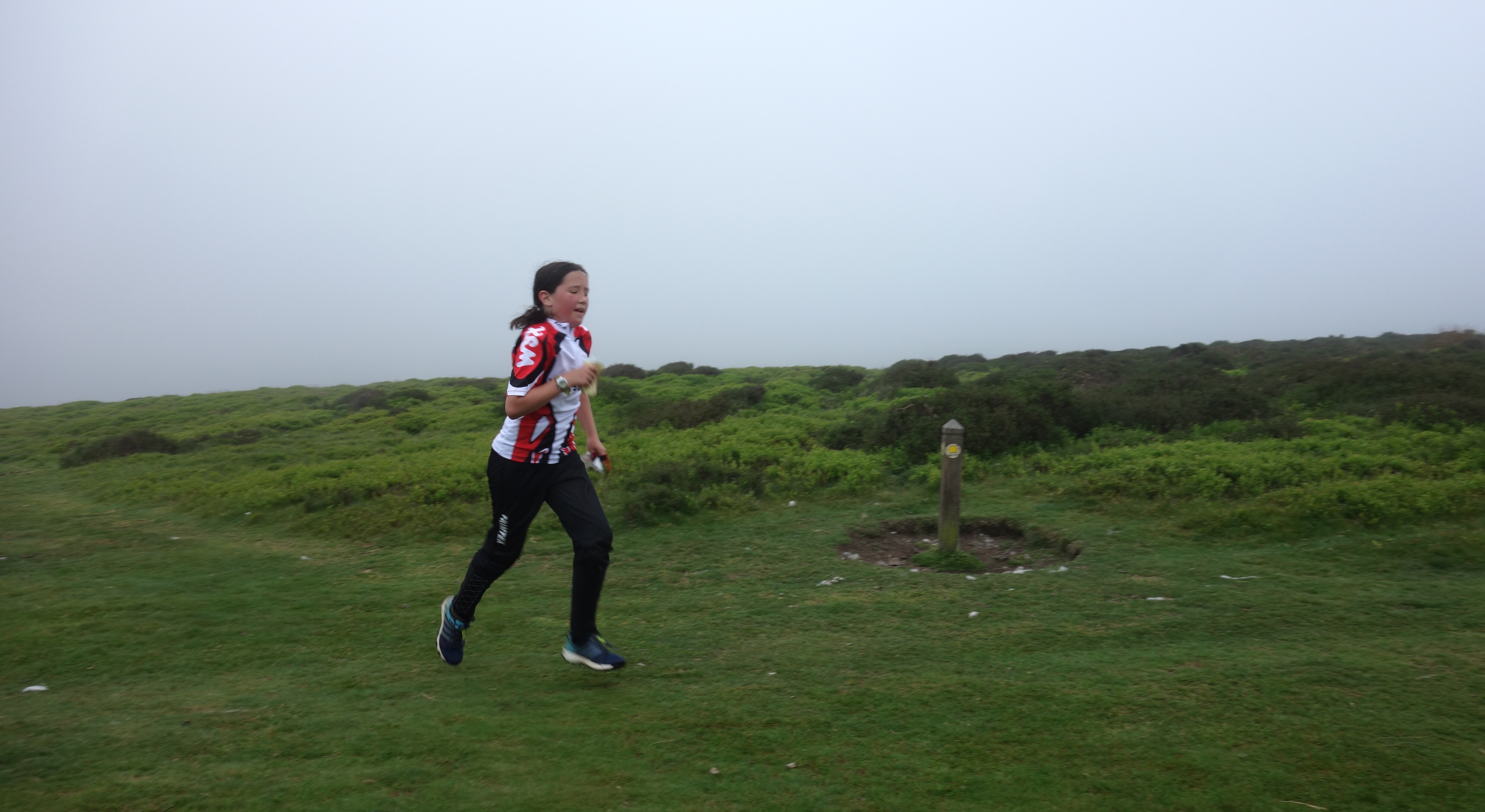 The first day of SINS was high on the Long Mynd, with the start at 470 metres. Although the drive up had been in sunshine, the cloud level quickly dropped as we approached the assembly; a windswept wintry location on the north side of the hill. The expectation of overheating on a sunny hillside with distant views of Shropshire faded away into rolling mist, a blustery and chill wind, and driving drizzle. I watched with some trepidation as Lyra and Rebecca disappeared into the banks of hill fog on their way to the start. This would test their use of the compass as well as their ability to leap over the heather-clad moorland.