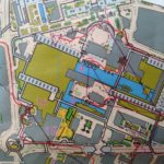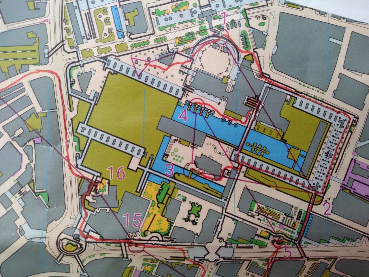 The Start was actually in the grounds of the Barbican Centre so, straight away, competitors had to get their heads around the multi-level complex. Because I’ve competed here twice before, and know how confusing it is to work out which level you need, and how to get there, I was determined right from the start to take it steadily and study the map carefully before choosing my route. Controls 1 to 3 were actually quite straightforward, but my head kept telling me that they weren’t and that I’d find myself on the wrong level when I got to the control circle. The delight when I found the control flags on arrival lifted my confidence. But…. this was soon to disappear as I tried to work out how to get to control 4. This involved a complex area which had ramps and steps in close proximity and which made it very easy to lose one’s sense of direction. Even having used these ramps before, and even after the Final Details giving enlarged extracts of the map of this section, I still got myself into a bit of a mess and so lost a few minutes. The route to 5 involved returning through the ramp system – better second time around! – but it was still tricky to see the route which involved crossing above a main road to the south side, then to cross it at road level to the north side where the control was located.